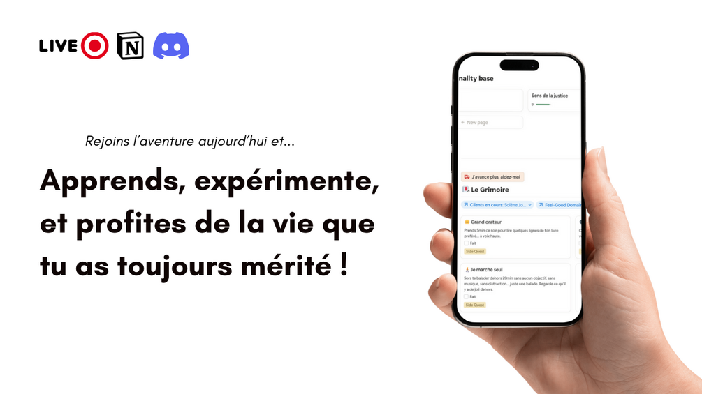 Te lever le lundi, non pas avec la boule au ventre, mais avec l'excitation de découvrir la prochaine Quête sur ton Dashboard personnalisé. Tu sais exactement quoi faire : la tâche est claire, décomposée, et tu as tous les outils Notion ou imprimés sur-mesure pour la réaliser. Tu passes 3 à 5 heures par semaine à avancer. Si tu bloques, un message sur Discord ou une session intermédiaire te remet sur les rails. Ce n'est plus du travail, c'est ta prochaine étape dans l'aventure.