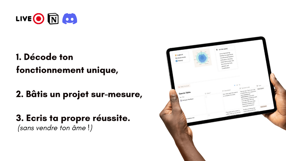 Te lever le lundi, non pas avec la boule au ventre, mais avec l'excitation de découvrir la prochaine Quête sur ton Dashboard personnalisé. Tu sais exactement quoi faire : la tâche est claire, décomposée, et tu as tous les outils Notion ou imprimés sur-mesure pour la réaliser. Tu passes 3 à 5 heures par semaine à avancer. Si tu bloques, un message sur Discord ou une session intermédiaire te remet sur les rails. Ce n'est plus du travail, c'est ta prochaine étape dans l'aventure.